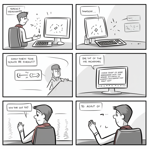 A hand-drawn storyboard with 5 panels. It should be made using a graphite pencil. the panels are as follows: Panel 1: Shows a computer screen with a warning or alert message that reads "CATEGORY 1", indicating some sort of prioritization or error classification. A person appears to be interacting with the computer. Panel 2: The same person seems frustrated, as indicated by the speech bubble that reads "IT'S SO SLOW AND LAGGY!!!", suggesting that the computer system is not responding well. Panel 3: Another character is introduced, standing and speaking to the seated person, saying "I just updated the UI so it can handle the system. It shouldn't lag now." This suggests that they have implemented a fix or improvement to the user interface. Panel 4: The perspective switches to the computer screen, showing a map with several buttons labeled "SEND ETA", which could imply a logistics or dispatch system for sending estimated times of arrival. Panel 5: The computer screen displays a message "PATIENT SAVED! SUCCESS", indicating that the actions taken were part of a medical or emergency response system and that the outcome was positive.