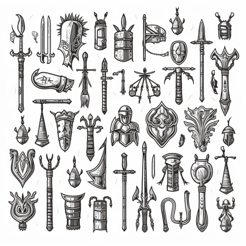 hand drawn medieval weapons doodle vector set, flat design, vector art, black and white, white background