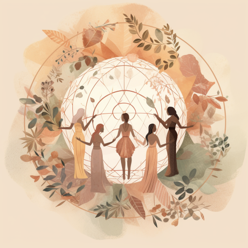 a circle of women holding hands in a circle around a beautiful living breathing earth, all connected through sacred geometry and luminous strands of connection, in a hopeful, natural and minimal style --v 5.0 --s 250