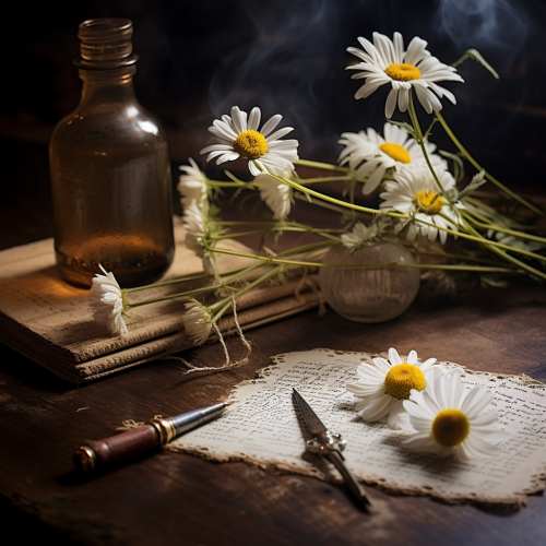 A chamomile flower is placed on an old wooden desk. There is an old fountain pen next to it, and it has a warm atmosphere overall.-chaos 20