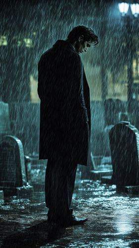 Bruce Wayne, wearing a dark suit and coat, standing in the middle of the rain at night during a funeral. The shot is from a distance, capturing the somber and emotional atmosphere. Bruce looks sad and emotional, with rain pouring down over him, adding a sense of heaviness and sorrow to the scene. The setting includes gravestones and a dark, wet environment, with subtle lighting from distant street lamps casting reflections on the wet ground. The sky is dark and cloudy, with a moody, overcast atmosphere. The style is inspired by Alex Ross's art, featuring realistic, highly detailed characters, dramatic lighting, and painterly textures. The rain adds texture and depth, emphasizing the emotional weight of the moment. The overall mood is melancholic, with a strong focus on Bruce's internal emotions and the mournful setting. --ar 9:16 --v 6.0