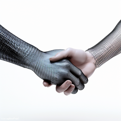A minimalist black and white scene where a human hand and a robotic hand gently touch at the fingertips, forming a connection symbolized by a single thin line that runs between them, merging organic and mechanical elements --ar 16:9 --v 6.0