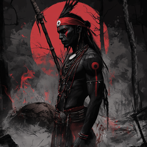 hand drawn style image with dominant black and red colors, highlighted, native Brazilian Indian man, red cap on his head with two ears up like a feline, spiritual black and red necklace, holding an axe, inside a closed forest, spiritual atmosphere, hand drawn style, focus on black and red colors, focus on every detail, sharp details, high quality, high quality graphics, 4k, artstation --v 6.1 --ar 9:16