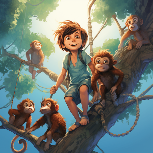 Image Description (Page 7): Oliver and Ella are surrounded by a group of scared monkeys perched high in a tree, clinging to a thin branch. Ella's trunk is stretched upwards, reaching for the monkeys, as she offers them a lifeline. Character Description: Oliver, Age: 10 years, Eye Color: Bright blue, Hair Color: Sandy-brown, Hair Style: Tousled, Height: 4'6" (140 cm), Body Type: Slim, Shirt: Crisp white button-down shirt with rolled-up sleeves, Pants/Bottom: Cargo shorts adorned with pockets, Footwear: Sturdy, scuffed hiking boots, Necklace: None, Glasses: None, Bag: Khaki backpack, Contents: Compass, map, magnifying glass. Styling Description Storybook Classic: Color Palette: Warm and muted; Artistic Style: Realistic; Brushwork & Textures: Soft edges, smooth texture; Line Work: Thin, soft lines; Composition: Rule of Thirds, classic composition; Lighting & Shadows: Soft, diffused light; Detail Level: High detail, especially on main characters; Borders & Frames: Thin, ornate gold frame; Mood & Atmosphere: Nostalgic, cozy; Cultural & Time Influences: Victorian-era England; Special Effects: Vintage filter, aged paper effect.