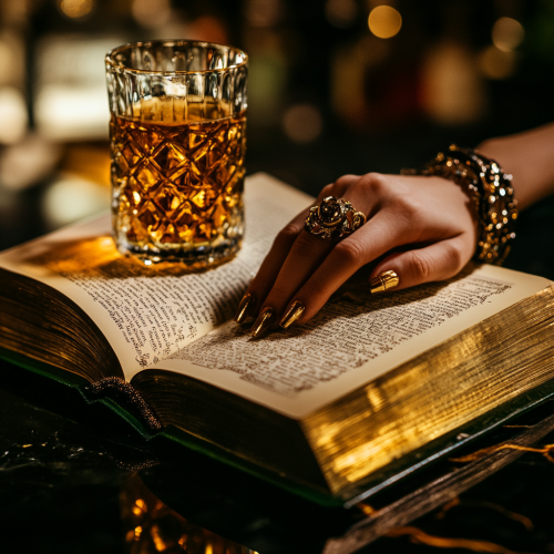 a photo of an open book sitting on a modern style bar with a portal in the pages, coming out of it is a stylish hand with gold rings and manicured nails holding a whiskey glass. bright and cheerful, colorful, green, black