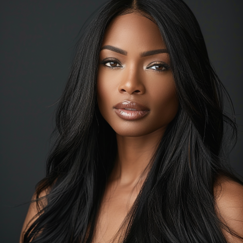 A beautiful African American woman with a long, black, straight lace-front wig is wearing soft glam makeup and a neutral lip color. She is posing in her luxury fashion studio for the camera.The background features high-end that complements the --v 6.0