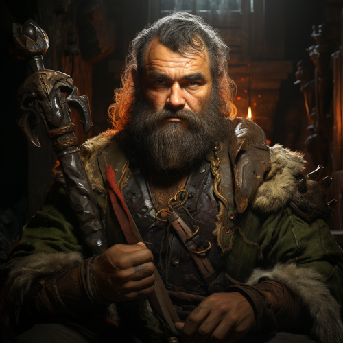 A massive dwarf who is in his late 40s. He has a long,b bushy beard that is braided and adorned with metal beads, he is bald and has battle scars. His eyes are a deep, intense brown and his expression is stern and focused. He is wearing a blue military uniform.