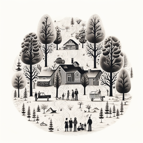 a black and white rustic nordic engraving style art of a family sticking and thriving together on white background