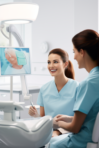 color photo of a realistic scene set in a dentist clinic on first half of the screen In the foreground, there is a receptionist seated at a desk in dental clinic Next to the receptionist, there is a blue AI robot, designed to help facilitate the conversation between the receptionist and the patient. On another half othe screen therre is patient women speaking in her house happy over the phone [1], [2], [3], [4], [5], [6] --c 10 --ar 2:3
