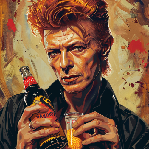 a cool poster of david bowie holding a bottle of maggi in his hands