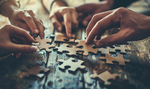 four hands each one holding a puzzle piece about to match each other, photorealistic, semi-neutral colors --ar 5:3 --v 6.0