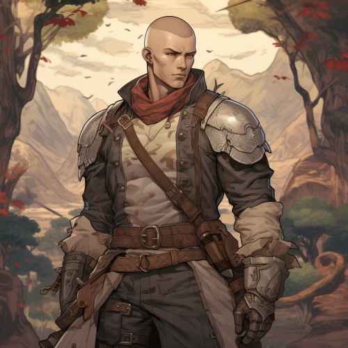 MAPPA anime art style of a handsome 23 - year - old battlemage with a shaved head, muscular build and bright hazel eyes wearing Witcher school of the bear armor and outfitted with a belt of potions, bombs, and daggers with a sheathed sword and crossbow on the back. Waist - up shot