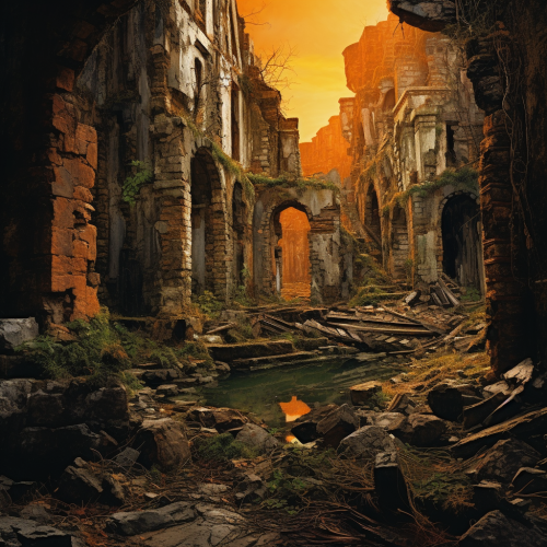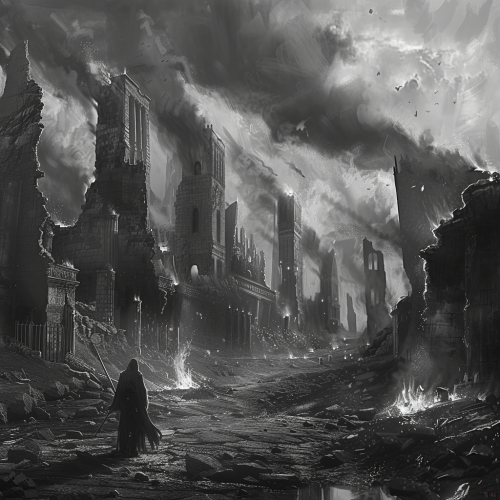 fantasy art, Now, as the winds of time sweep across the scarred landscape, the ruins stand as a silent testament to the hubris of those who dared to wield such terrible power. The memory of the city consumed by fire serves as a cautionary tale
