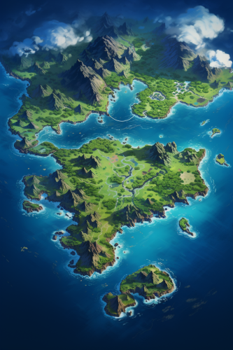 A flat 2d satellite map of a massive pacific territory spanning hundreds of square miles with multiple tropical islands, two of the islands being much larger than the others, the map should show topology, natural landmarks, and city ruins, the map should have no lettering --ar 4:6
