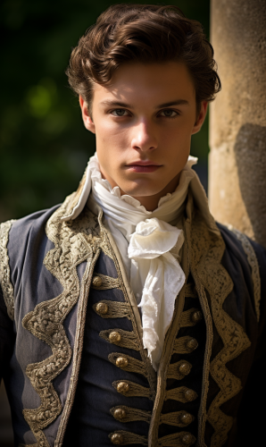 Photo of handsome young man (ancestry= 50% French, 50% Spanish) dressed as a French nobleman at a French villa in 1866. --ar 3:5 --v 5.2
