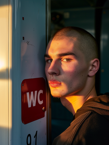 Handsome guy on a train bathroom door
