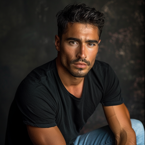 handsome gay latino man wearing dark blue t-shirt, blue jeans, posing, mysterious, night, textured black background --s 250 --v 6.0 --style raw