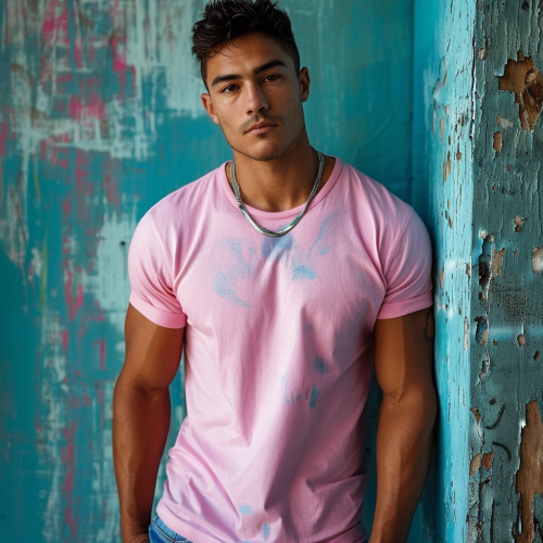 handsome gay latino man wearing pastel pink t-shirt, blue jeans, posing, mysterious, textured background --s 250 --v 6.0 --style raw