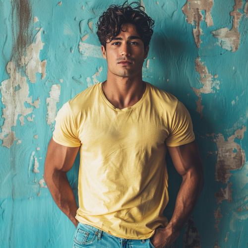 handsome gay latino man wearing pastel yellow t-shirt, blue jeans, posing, mysterious, textured background --s 250 --v 6.0 --style raw