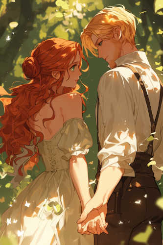 lovers holding hands and turning around in the forest, they are the same height, the girl has long red hair and hazel eyes, the boy has undercut light brown hair on a hair bun and green eyes --ar 2:3 --niji 6