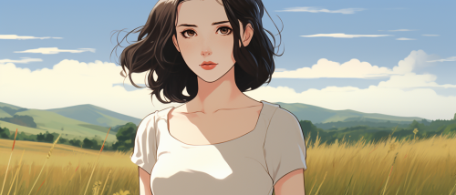 a giant anime winona ryder wearing a white crop top walking across a cartoon grassy field --ar 21:9