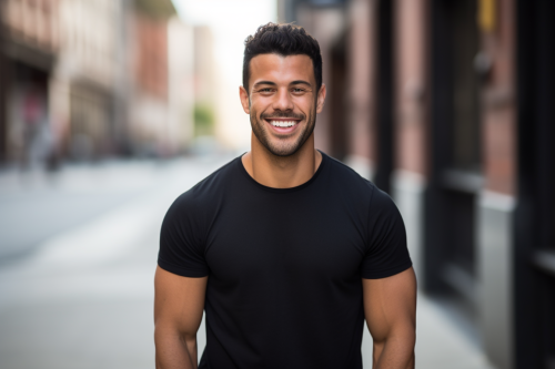 a photography for a product page of a handsome black man smiling dressed with white jersey, black background --ar 3:2