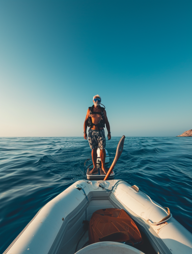 straight on front view color photograph of a man wearing snorkeling gear on a boat midday --ar 9:12 --s 50 --v 6.0
