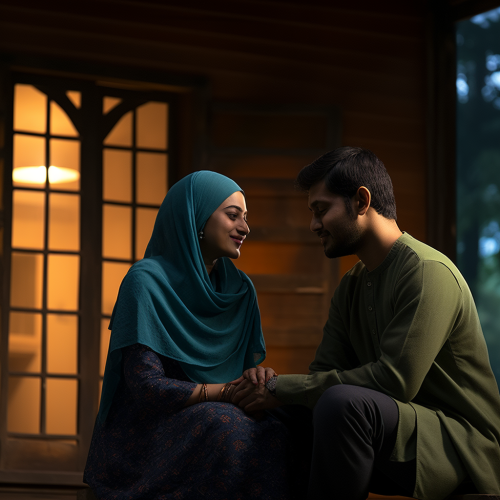 / a romantic film still of a couple having conversation in thier dreams,husbend apologizing for his mistakes, she wearing cyan hijab and brown weaters and dental braces, he wearing black t - shirt, indian muslim couples, kerala, domestic scene –ar 21: 10