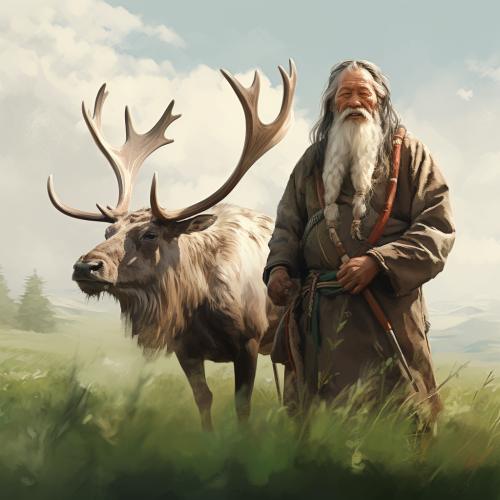 an old Kazakh nomad with a white beard and a pointy wizard hat roaming through the green grass steppe on the back of a brown elk, digital art, brush movement, painting style