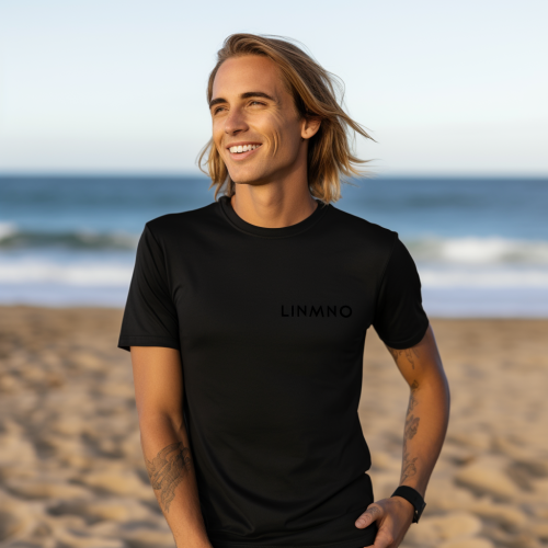 A handsome young man with short black hair, wearing a white shirt, sitting on the sandy beach, captured from a side angle in a Korean drama atmosphere, gazing out over the vast ocean. The scene is quiet and serene, evoking a sense of solitude and contemplation, as he is surrounded by endless waves and the open sky. --ar 16:9