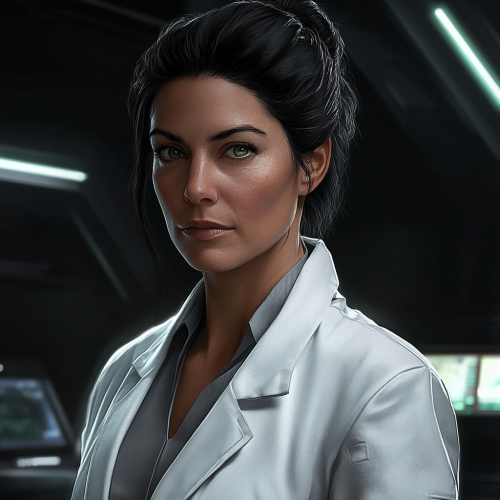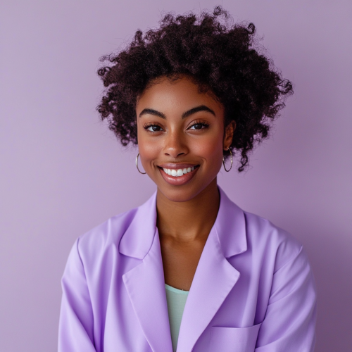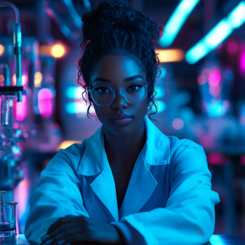 Geeky, intelligent Disney black female wearing a lab coat. Sitting behind a chemistry lab. Looking straight to the camera, centered character portrait, a character in the middle, excellent background with bright lights.
