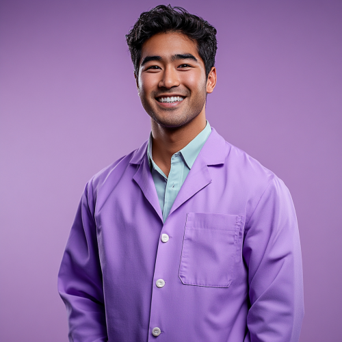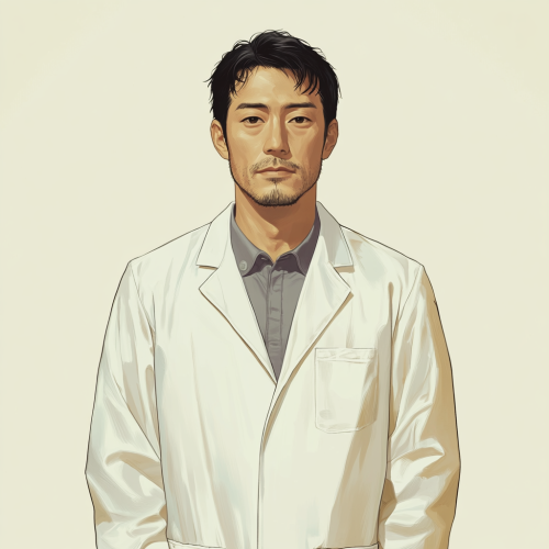 Illustration of a Japanese man in his 40s wearing a white lab coat with a cool atmosphere. Only the upper body is shown. There is no background. He is facing forward. He is knowledgeable about history and science.