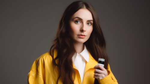 hyper real photo of a woman with dark long hair, tucked behind shoulders. She is standing against a white background in a studio setting. she is wearing a bright yellow lab coat holding up a small tube of face cream. She is looking to camera. She is friendly. --ar 16:9 --v 5.0 --s 750