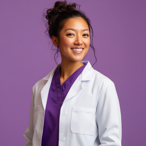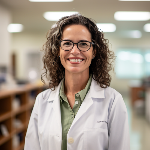 a woman, born in Brazil, fifty years old, wearing glasses, doctor, smiling, wearing a lab coat in a professional photo inside the medical care office, photo in an American shot