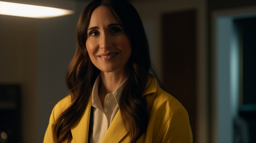 a hyper real photograph of a women in her 40's with long dark hair in an upscale bathroom wearing a yellow lab coat with a crisp collar. she is smiling, talking to someone off camera. We see her entire body in the frame. the lighting is bright and cinematic. --ar 16:9 --v 5.0 --s 750