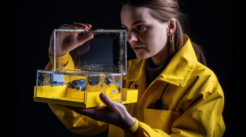 photograph of a woman in a yellow lab coat holding yellow box open. colourful, photorealistic, highly detailed, transparent parts, looks like a professional hdr photograph in a fashion magazine. camera is close-up on the open box. --ar 16:9 --v 5.0 --s 750