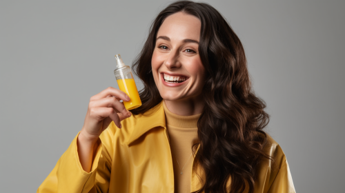 hyper real photo of a woman in a studio setting. she is wearing a bright yellow lab coat holding up a small jar of face cream. She is looking at camera smiling. --ar 16:9 --v 5.0 --s 750