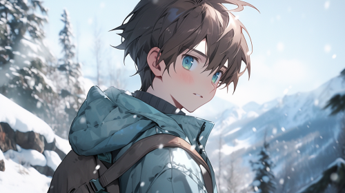 A handsome boy in the winter mountains, brown hair and blue eyes, --ar 16:9 --niji 5