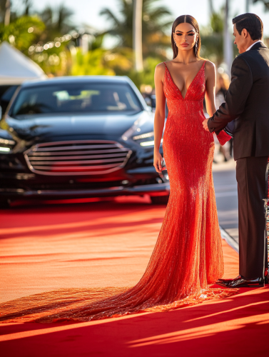 low angle, LOW CAMERA ANGLE, female 20 year old hollywood star exiting car, red carpet ceremony, entrance with car, chauffeur opening door to car, real photography, --ar 3:4 --v 6.1