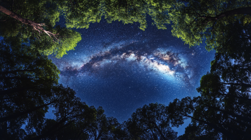 Real photos in the Asian forest, taken from a low angle, looking up to see the Milky Way. The images are sharp and realistic, with excellent details that look real --ar 16:9