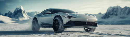 A 2024, reflective white, Ferrari Purosangue SUV, riding on the ice field in Antarctica powder, low-angle shot, photorealistic, product photography, Cinematic, natural light, global illumination. --ar 144:41