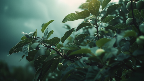 low angle of guava tree weathering the storm in the philippines. cinematic, mood. --v 6.0 --style raw --ar 16:9