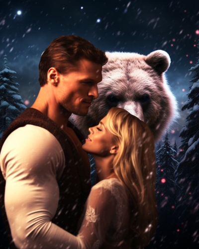 in the style of das schwarze auge, a tall blonde barbarian with a two-handed axe runs towards an angry tall bear on its hind legs, light forest in the background, land and bear have the same height