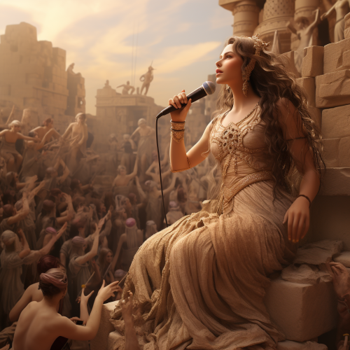 Ancient sumerian princess singing about onnanes and anunakis hand, in the ancient city of Eridu, on eof the first recorded cities of man kind, singing about the sumerian acomplishments, realistic, ancient city scene, long-shot, double helix, double helix Genetic Molecules background, ape --ar 1:1 --s 250