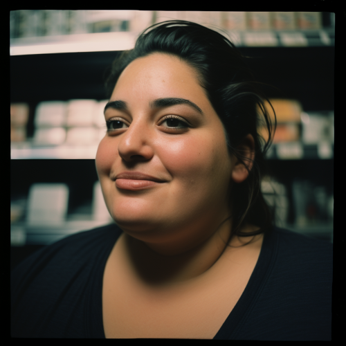 Real woman, age 35,mugshot, olive skin, big nose, double chin, round face, overweight. Right facing, profile shot, medium shot. Happy face., open smile. Dark background. In a grocery shop. Polaroid --stylize 25 --v 5.2