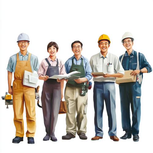 A group of happy representatives of Taiwanese professionals, including plumbers, computer engineers, painters, bakers, and architects, white background