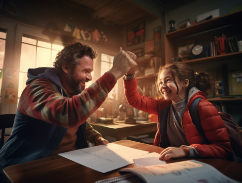 A fun, lighthearted image of a middle aged Mexican woman high-fiving herself in a mirror, celebrating a small win with a big smile. A woman high-fiving herself in front of a mirror, excited and playful. Wearing red and blue. Keywords: playful, celebration, high-five. Camera: DSLR, Lens: 35mm. Post: Bright, cheerful, with high contrast for a fun, celebratory feel.