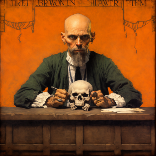 a handsome bald man with brown beard looking at a jack-o-lantern on his rustic desk. Norman Rockwell Saturday Evening Post Cover 1920s.