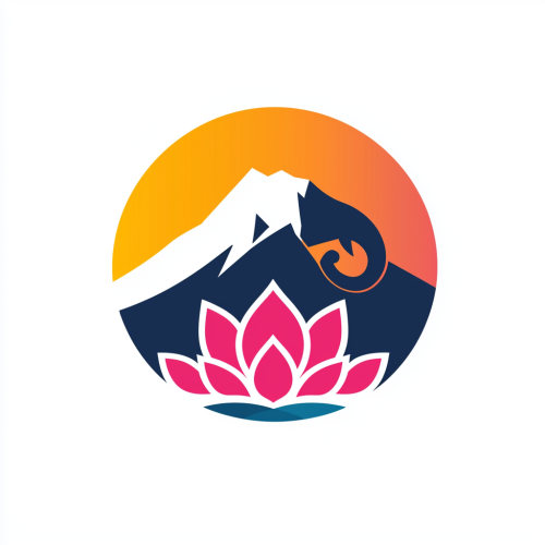 Vector logo design with a lotus flower at the bottom, above the lotus flower is an elephant with trunk up, behind the elephant is a mountain, below the mountain is water, the whole logo consists of a circle, flat design, pure color,white background,abstract design, graphic style --v 6.1 --quality 2 --style raw