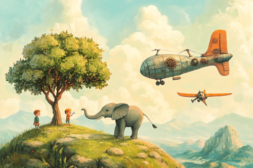 A whimsical children's book illustration showing a happy boy and elephant on a grassy mountain, with an olive tree nearby. Parked next to the tree are a small airplane, a bird-shaped glider, and a steampunk blimp with detailed gears and propellers.Soft, playful tones, hand-painted pastel colors, minimalistic and vibrant --ar 3:2 --v 6.1